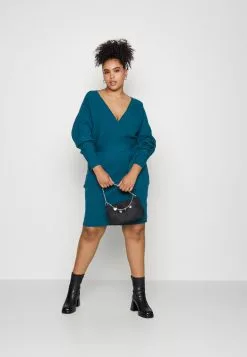 Wrap V Ausschnitt Mini Strickkleid Mit Gürtel – Robe Pull – Teal